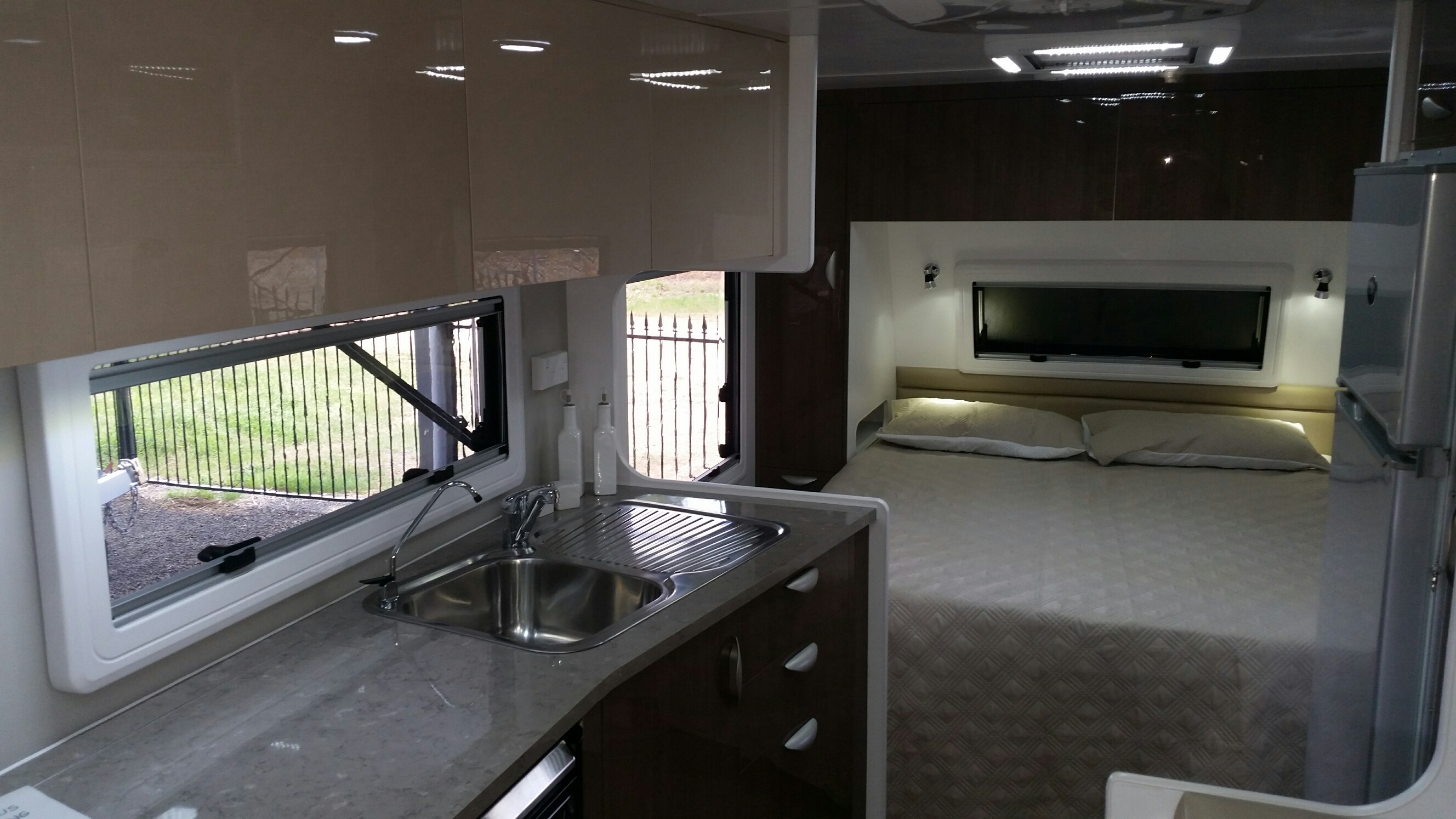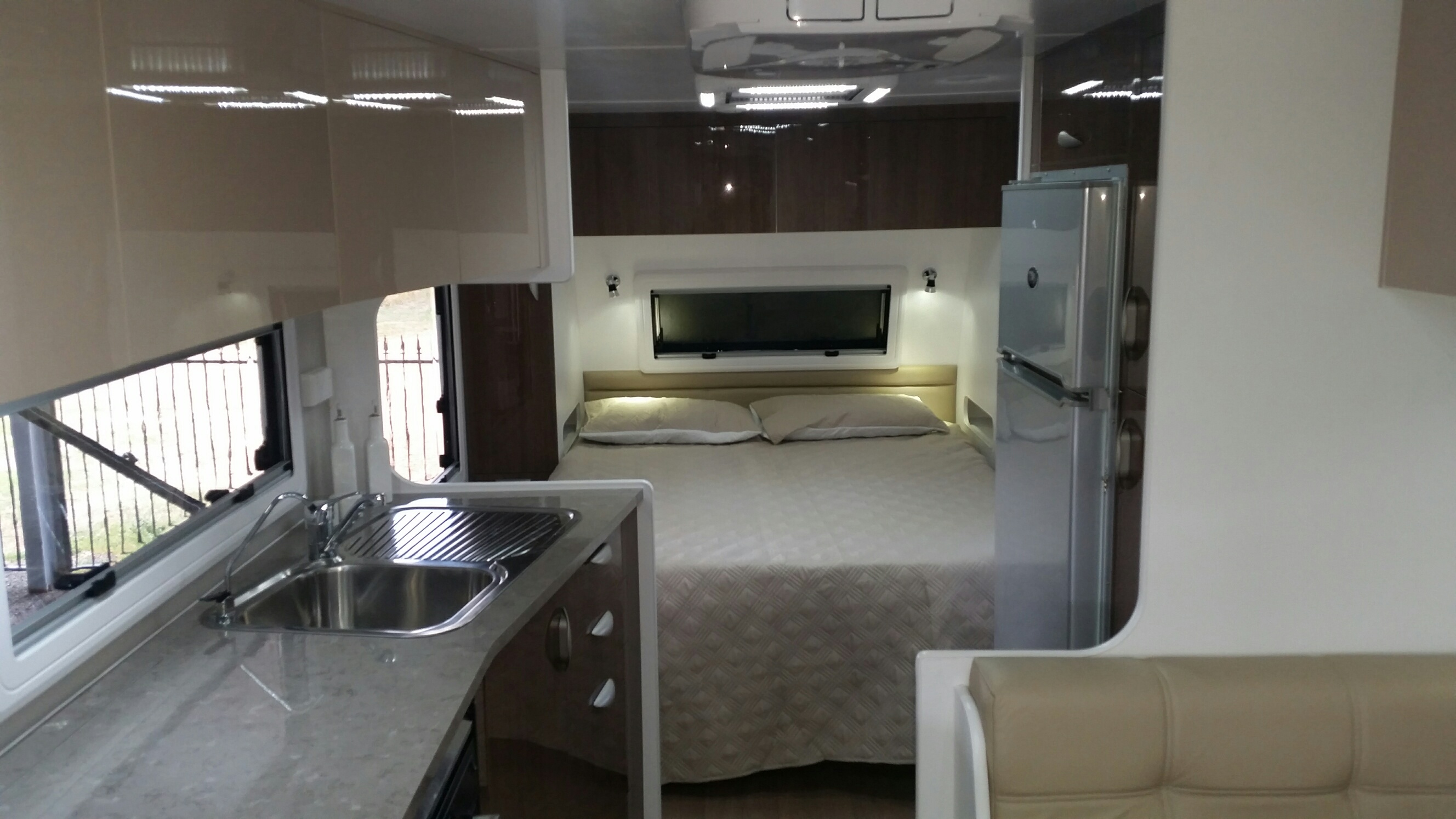 Includes compressor fridge, 2×95 ltr watre tanks, a grey-water tank, separate shower/toilet ensuite, leather cafe-dinette, microwave oven, separate water filtered tap, TV, radio, Queen island bed, and much more!